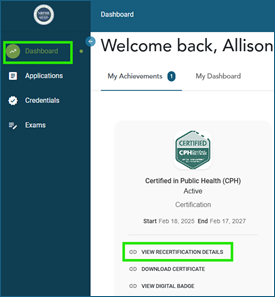 - Next, click on “Dashboard” to the left and select “View Recertification Details.”