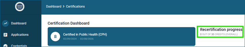 - You are now in your Certification Dashboard! The “Recertification Progress Bar” indicates the total number of credits required to reinstate. As a reminder, you need to report 30 credits for every 2-year recertification cycle you have missed. Additional credits are required since you have gone over the original deadline.