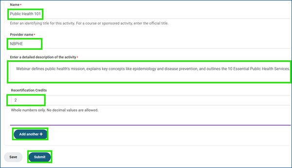 - Enter the “Name,” the “Provider Name,” provide a short, but detailed description of the activity, and input the number of credits. Click on “Add Another” to add additional activities to report in one application. Once done, select “Submit.”