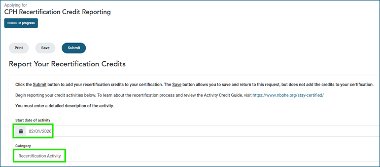 - Enter the Start Date for the first activity and select “Recertification Activity” under category.