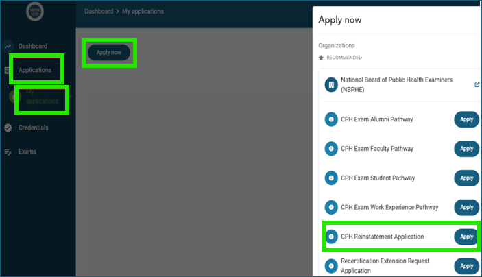 - Once you have reported all the required credits, you can now apply to Reinstate! Click on “Applications,” then “My Applications,” select “Apply Now,” and click on “Apply” next to the CPH Reinstatement Application.