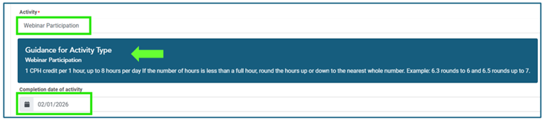 - Select the “Activity” from the dropdown. The system will provide guidance on the number of hours that can be reported per activity type. Enter the “Completion Date.”