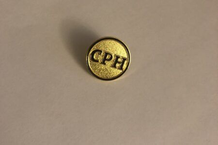 Gold-plated lapel pin featuring the CPH logo with military clutch-style backing. 19mm diameter, 1.7 mm thickness.